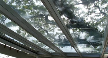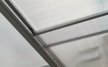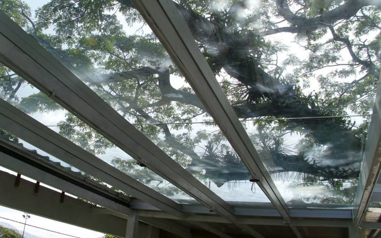 Techos fabricados en vidrio en laminas de policarbonato alveolar con estructura de aluminio. . Espesores y estructura según cálculo de cargas. Ideal para pérgolas cubiertas, patios interiores, atrios y terrazas.