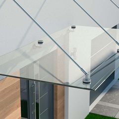 Techos en vidrio laminado o templado laminado con herrajes de acero inoxidable. Los herrajes permiten una instalación más limpia visualmente con menos estructura visible. Mayor resistencia ante cargas de viento y lluvia. La solución premium para proyectos arquitectónicos de alta exigencia estética.