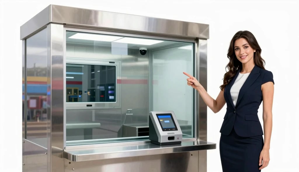 sistema completo de taquilla para atención nocturna y de alta seguridad. Integra vidrio blindado, Ranura pasa tarjeta/pago, gaveta, cajón de intercambio, intercomunicador de doble vía, iluminación interna y sistema de alarma. Instalado en el frente del negocio. El cliente es atendido con plena seguridad sin abrir la puerta principal.