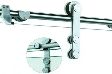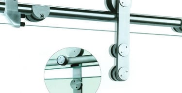 Puerta corrediza en vidrio templado de 8 mm con accesorios Euro Slider de acero inoxidable. Diseño completamente minimalista.