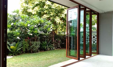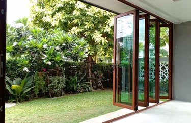 Sistema de puertas plegables enmarcadas en aluminio con vidrio templado o laminado de 8 mm. Las hojas se pliegan lateralmente liberando el vano completo.