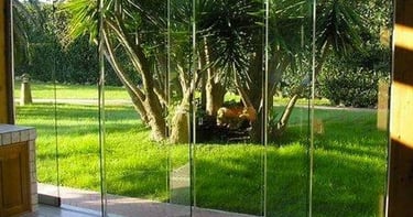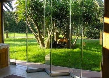 Sistema de puertas plegables enmarcadas en aluminio con vidrio templado o laminado de  8 mm. Las hojas se pliegan lateralmente liberando el vano completo.