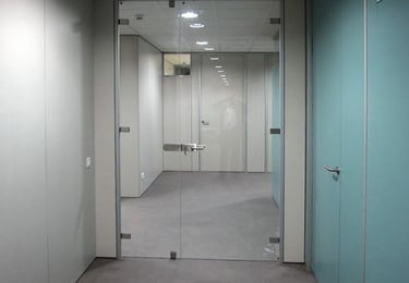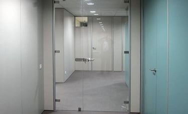 Vidrio templado con bisagras de acero superior e inferior. Diseño elegante y discreto ideal para oficinas.