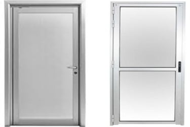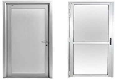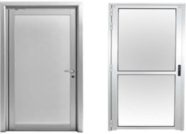Versión de dos hojas de la puerta batiente de aluminio. El vidrio va dividido en ambas hojas con bisagra central.